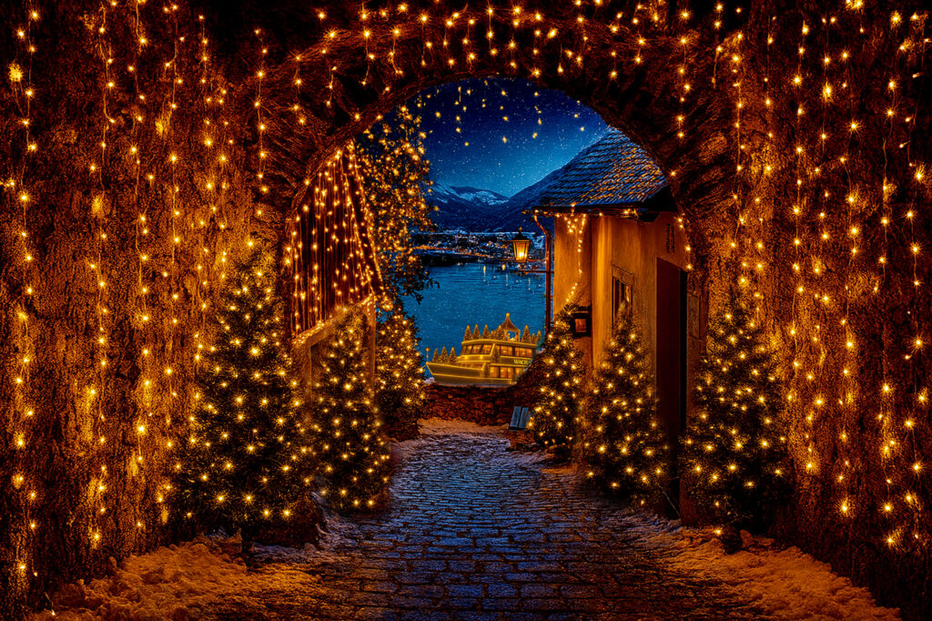 Über dem alten Weg leuchten Lichterketten, festlich geschmückte Bäume begleiten den Pfad – ein romantischer Spaziergang im Glanz der Adventzeit.