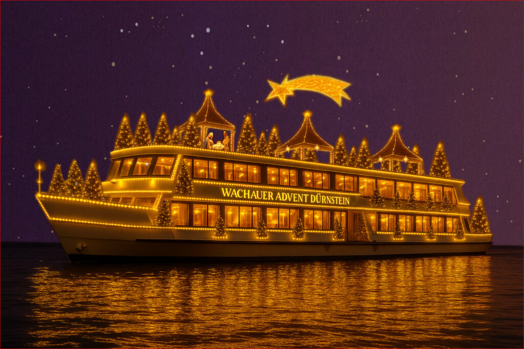 Festlich erleuchtet liegt es an der Donau – ein schwimmender Adventmarkt, wie es ihn in Österreich noch nie gegeben hat. Mit geschmückten Bäumen, Lichterketten und stimmungsvollen Ausstellern wird das Schiff selbst zur Bühne voller Weihnachtszauber.